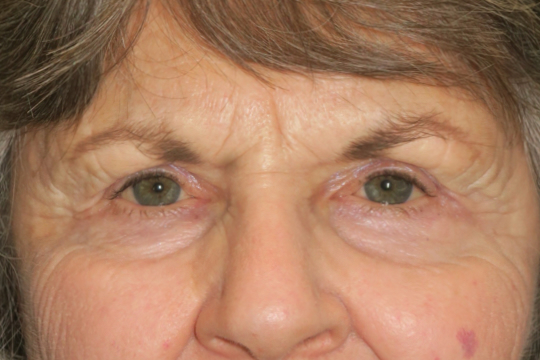 67-year-old Caucasian female. She complained of heavy eyelids blocking her vision.